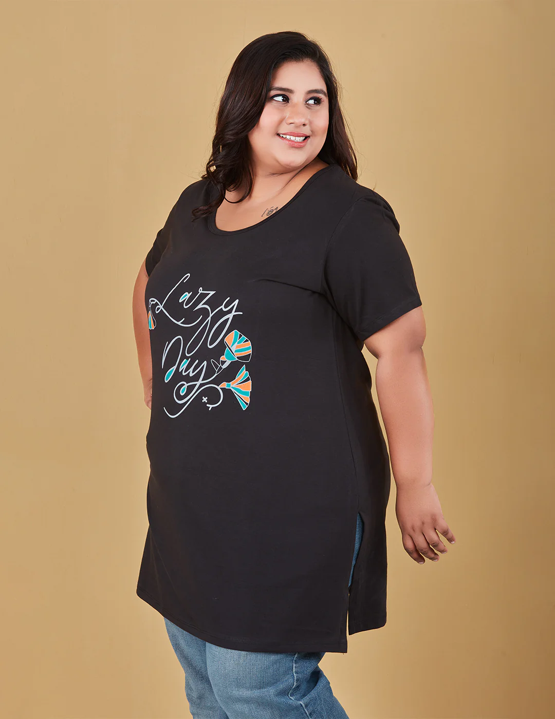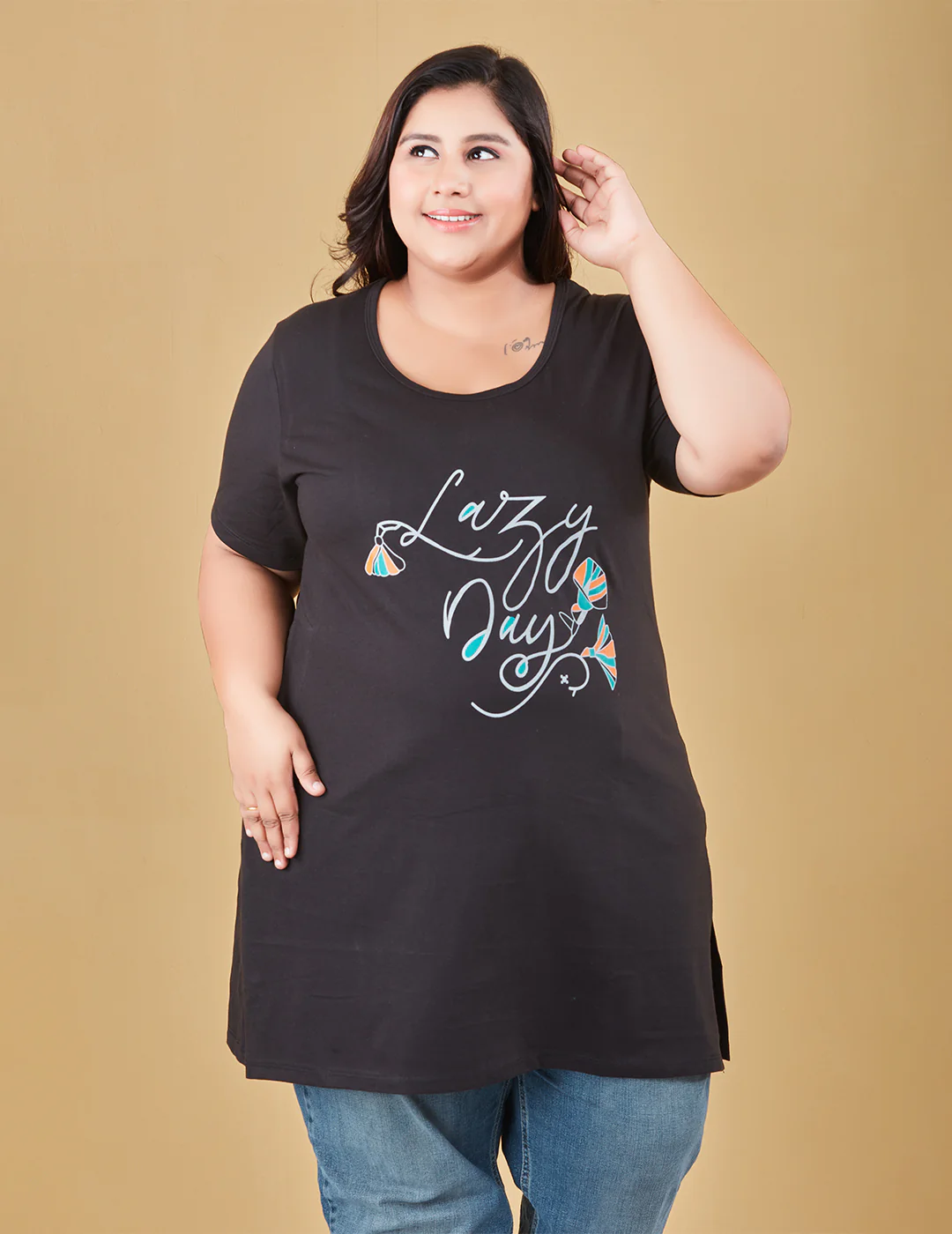 Cotton plus size long t-shirt for women available in 3XL, 4XL, and 5XL sizes. Regular fit, round neckline, half sleeves, and graphic print combine classic and casual styles. Made from lightweight, breathable, and quality cotton fabric, this women long t-shirt gives a summer-ready look. It makes a perfect women’s essential for everyday use, giving them ultimate comfort all day long. This plus size long top is simple in design and makes it a perfect choice for daily wear, sleepwear, loungewear, and more.