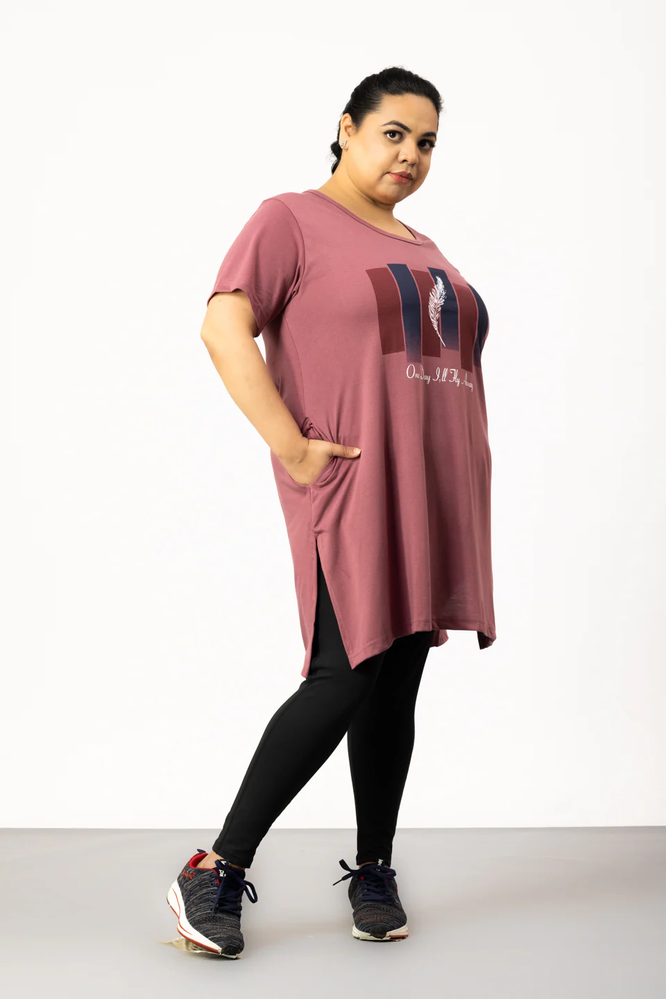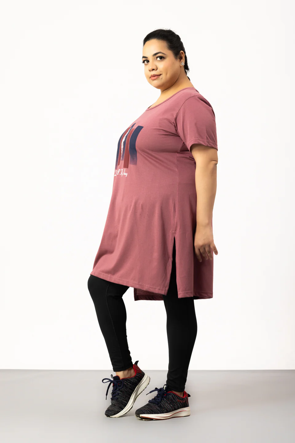 This long t-shirt for plus size women has side slits that provide ease of movement and prevent wear or tear.