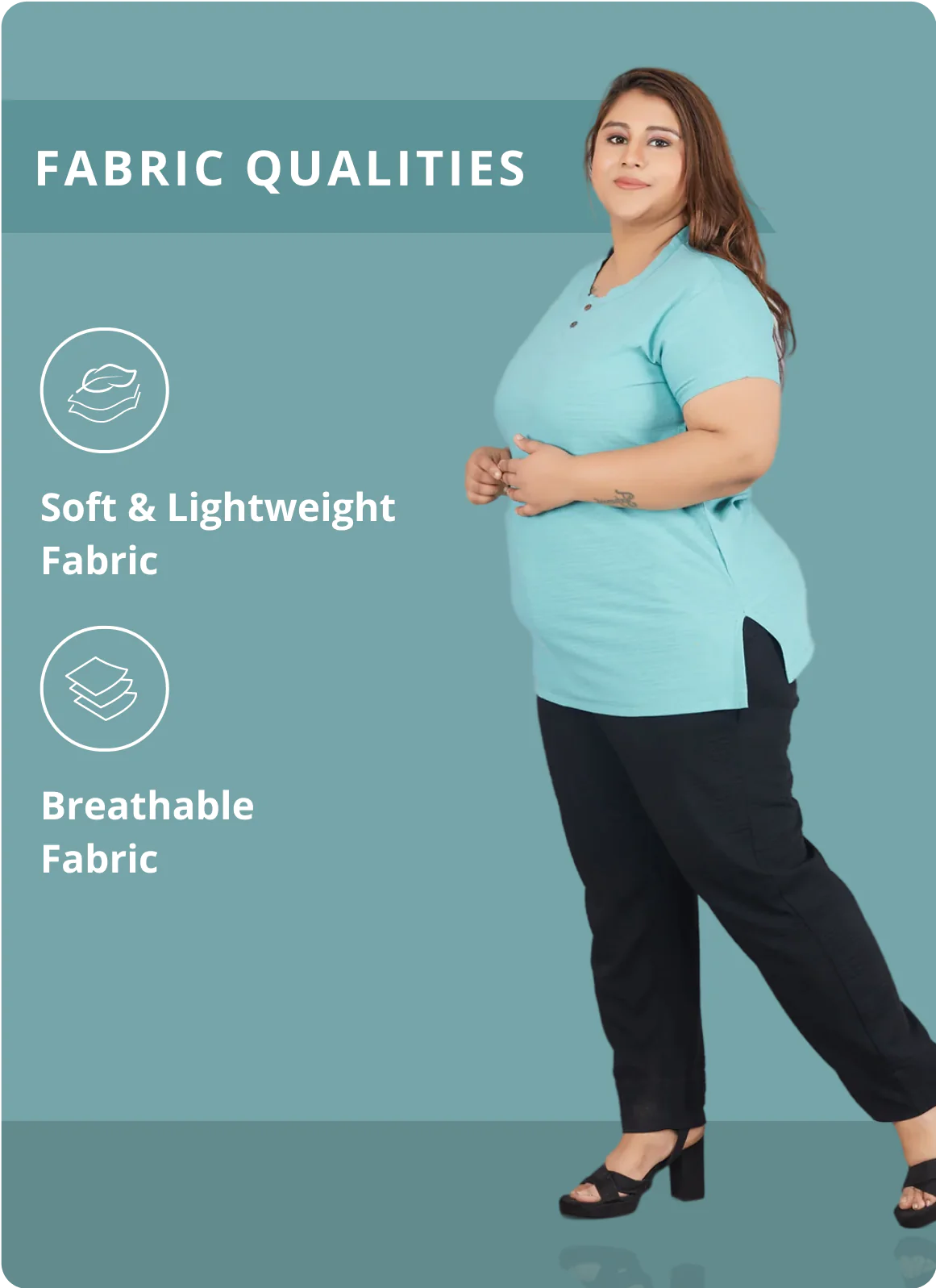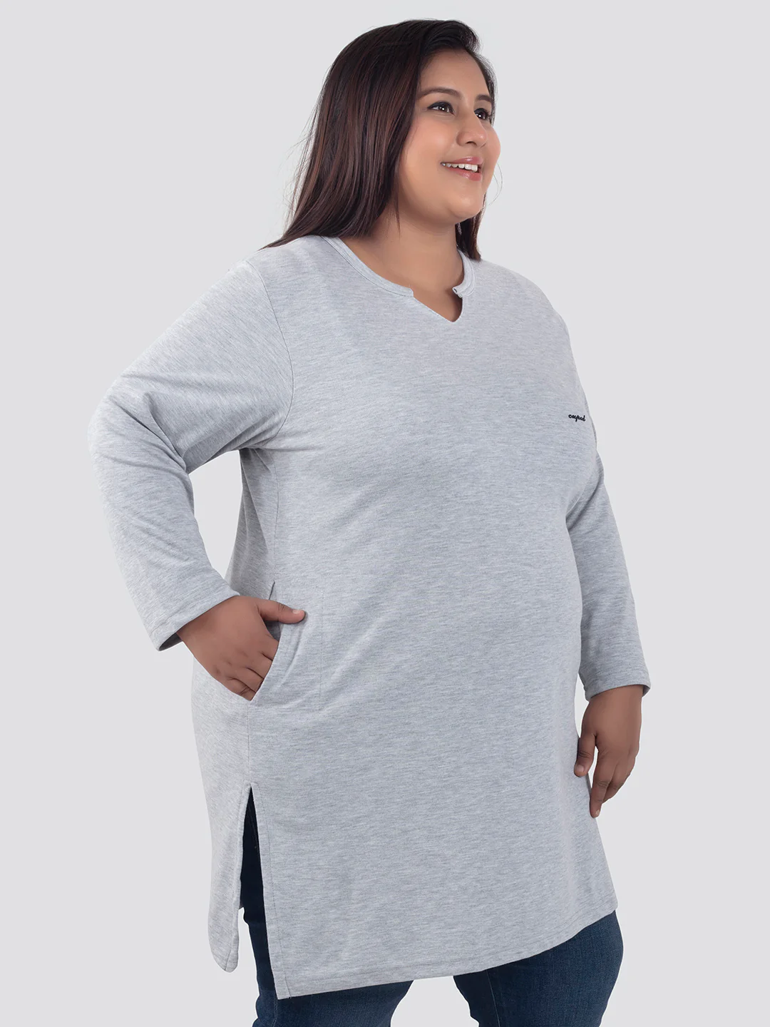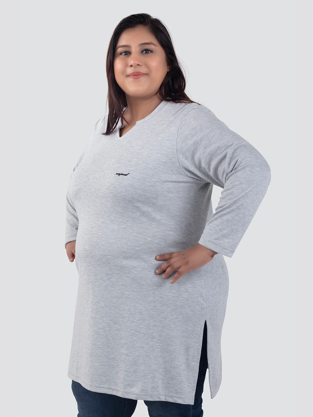 Plain solid plus size long top for women made of heavy GSM cotton in L, XL, 2XL, 3XL, 4XL, & 5XL sizes. Full sleeves, side cuts, V-neckline, and hip coverage makes it super comfortable. The high-quality material adds more softness to this long t-shirt for women. Moreover, it is available in a variety of sustainable and everlasting colors. Whatever you choose, it gives the perfect look and cozy feel. Simply add it to your winter collection and make it a go-to fashion staple by pairing it with your favorite jeans or any bottom. Get your own crazy style and beat the cold with this elegant yet cozy full sleeves long top or long t-shirt for curvy ladies.